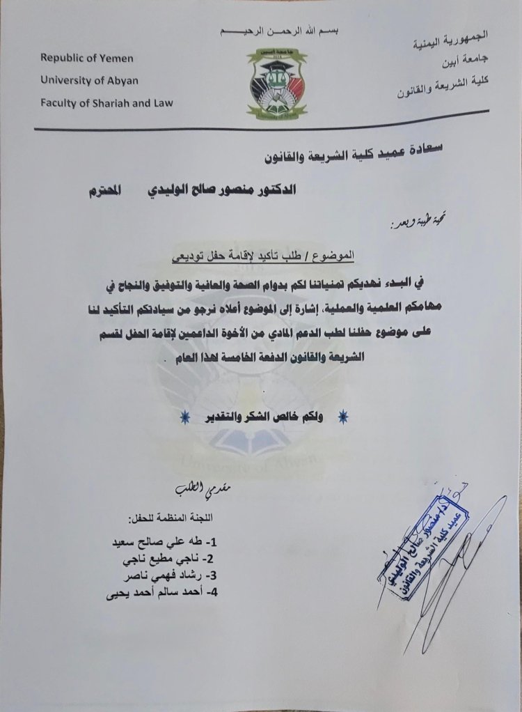 إحياءً لذكرى الشهيد عبداللطيف السيد: دفعة الشريعة والقانون بجامعة أبين تدعو لرعاية حفل تخرجها